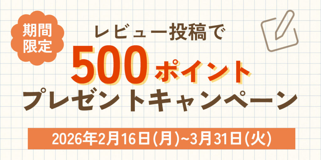 ただいま、期間中に商品レビューを投稿いただくとポイントがもらえるお得なキャンペーンを実施中です!
